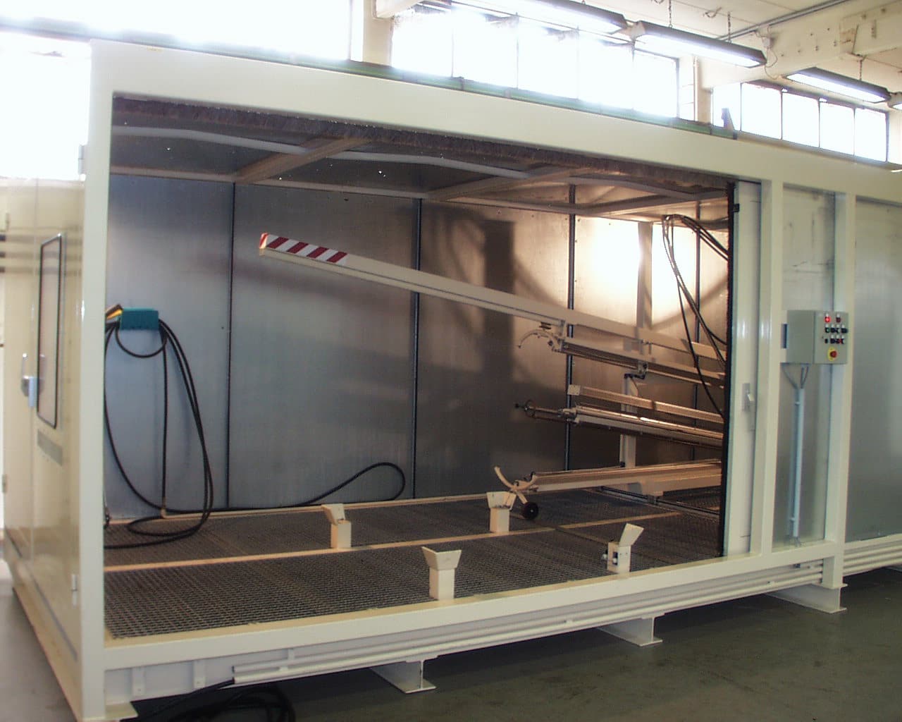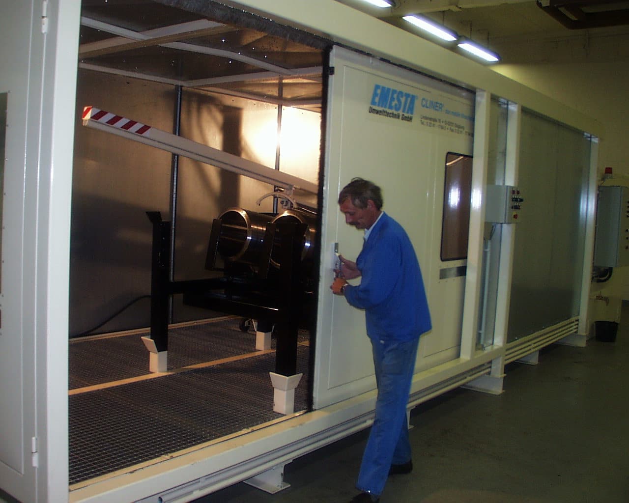 Besonders beeindruckend an dieser Anlage ist der für damalige Verhältnisse hohe Automatisierungsgrad. Die Bauteile werden in einem Gestell in die Waschanlage eingebracht, ein Sprühbaum sorgt für die gründliche Innenreinigung. Es ist erstaunlich, wie sehr wir uns schon vor über 20 Jahren für die Problemlösung unserer Kunden eingesetzt haben!