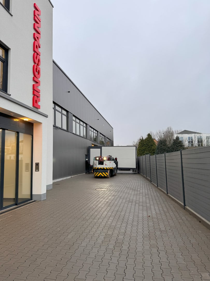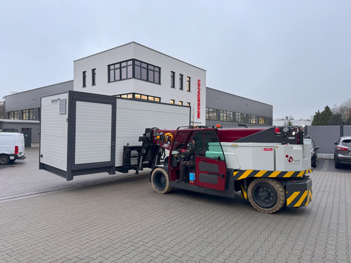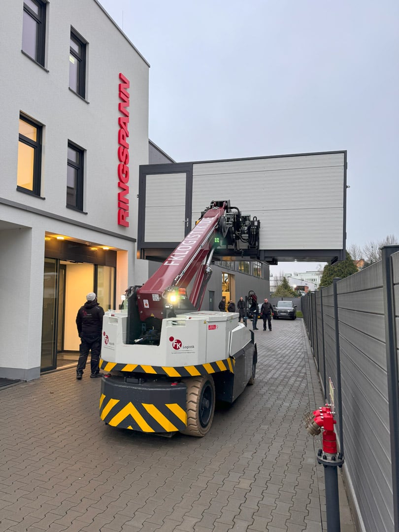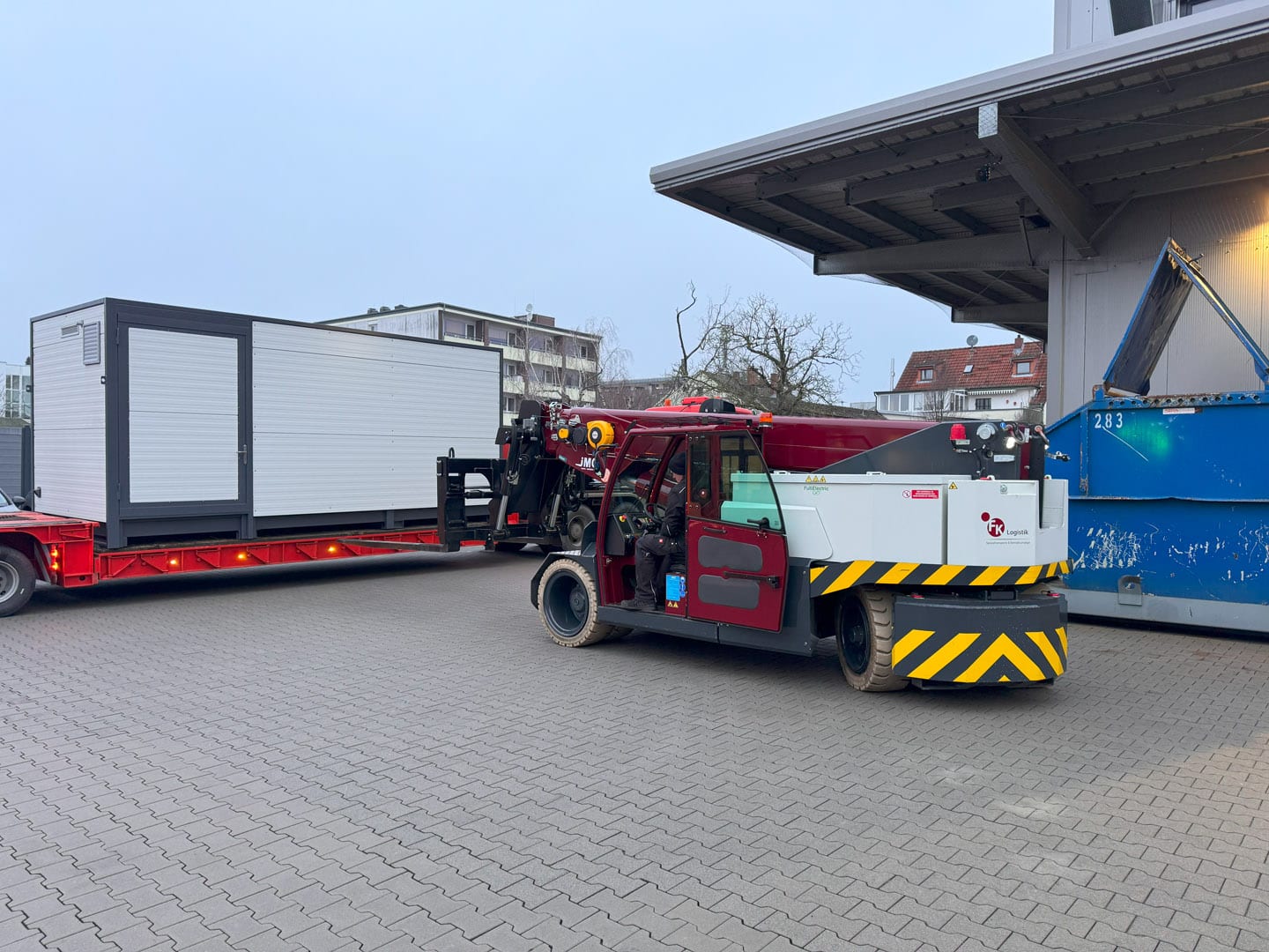 Die Herausforderung bestand darin, den neuen, geometrisch anspruchsvollen Standort zu erreichen. Hier war das Know-how von FK Logistik gefragt, die mit einem Elektro-Teleskopstapler anrückten. Mit diesem beeindruckenden Gerät, das Lasten von bis zu 16 Tonnen heben kann, konnte die Anlage mühelos an ihren neuen Standort gebracht werden.