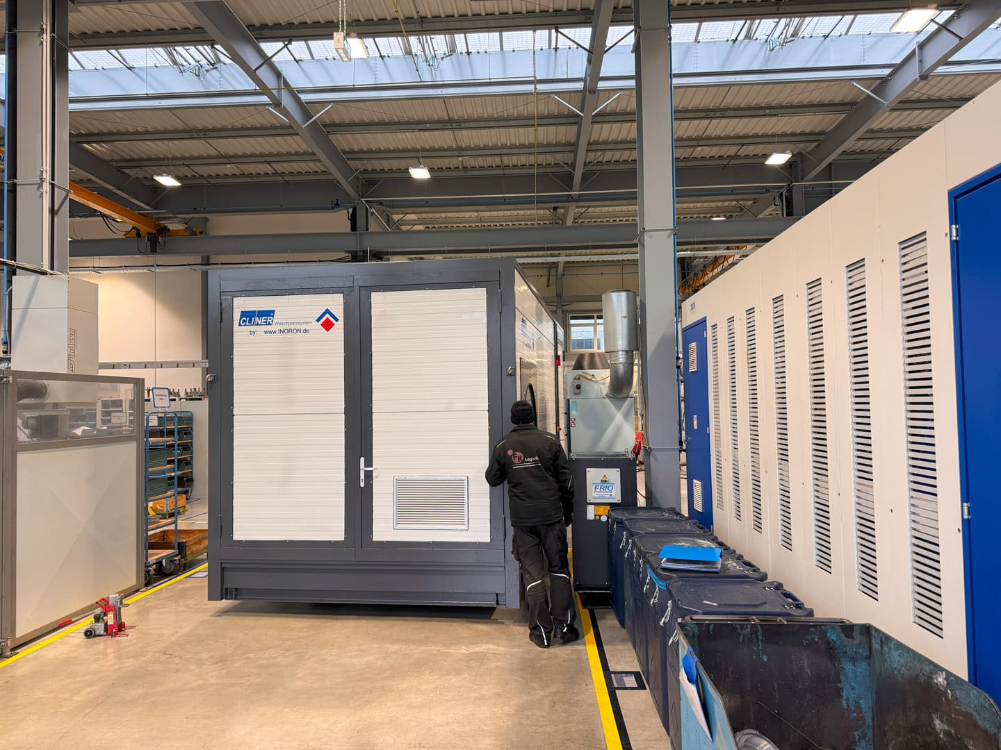Nach der exakten Positionierung im Hallentor wurde der CLINER-Waschplatz auf Panzerrollen an seinen endgültigen Standort gefahren und mittels Hydraulikpumpen sicher abgesenkt.