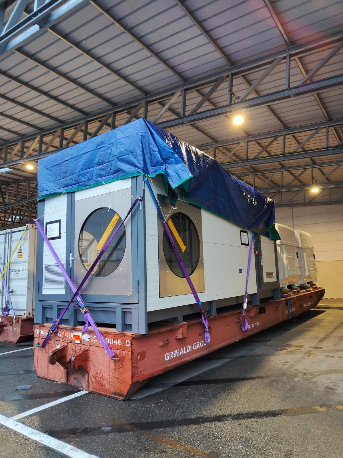Auf seiner Reise über den Atlantik hat der CLINER eine ungewöhnliche “Badekappe” erhalten. Aufgrund eines kleinen Kommunikationsmissverständnisses wurde die Anlage nur im oberen Drittel geplant. Das Ergebnis ist ein humorvoller Anblick, der jedoch die Funktionalität des CLINERs nicht beeinträchtigt, da er sicher unter Deck des RoRo-Schiffes “Atlantic Sail” verstaut ist.