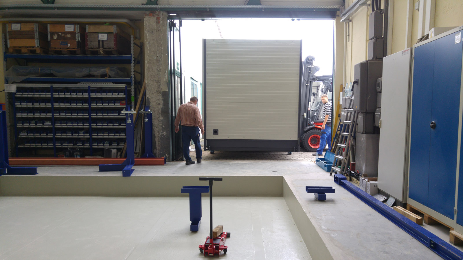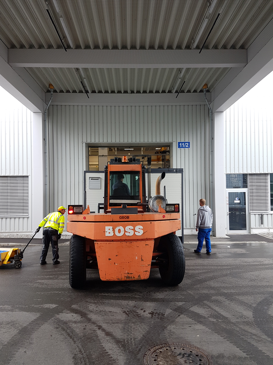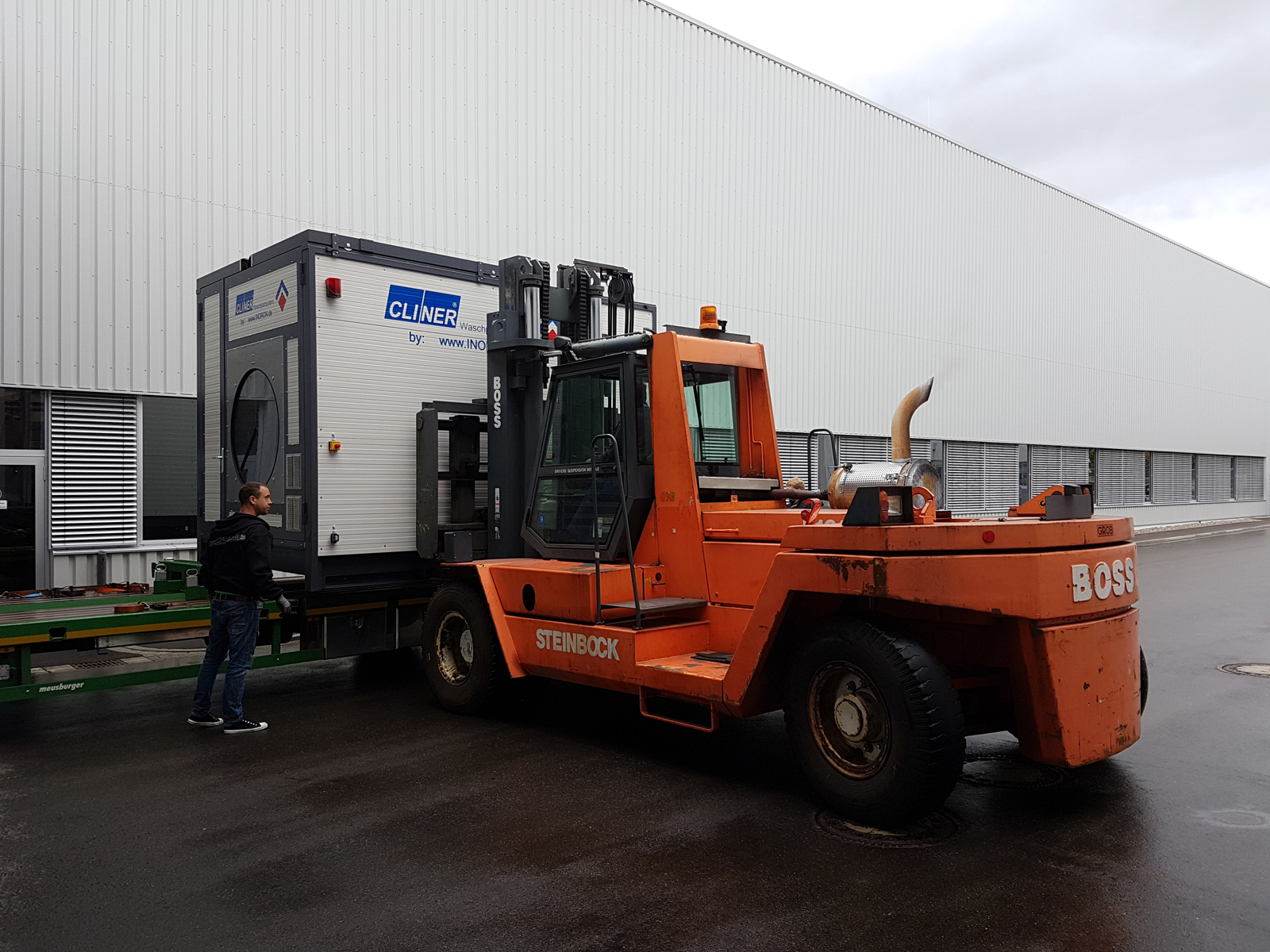 Dieser Kunde wollte gerne den Waschplatz möglichst nah an seiner Produktion haben. Einen Raum für den Waschplatz gab es auch bereits. Da der Kunde bereits wusste, dass ein Teil der Produktion innerhalb des nächsten Jahres umgestellt werden sollte, kam ein fester Waschplatz nicht in Frage. Ein fester Waschplatz hat neben einem umständlichen Genehmigungsverfahren einen weitaus größeren Nachteil: er ist nicht ortsveränderlich. Leider war der Zugang zu dem Raum recht niedrig, so dass wir die Höhe der Anlage an die Gegebenheiten vor Ort angepasst haben. Den großen Gabelstapler des Kunden konnten wir zum Abladen vom LKW benutzen, doch in der Halle haben wir die Anlage mit Gabelhubwagen transportiert.