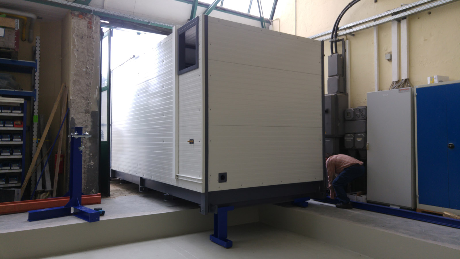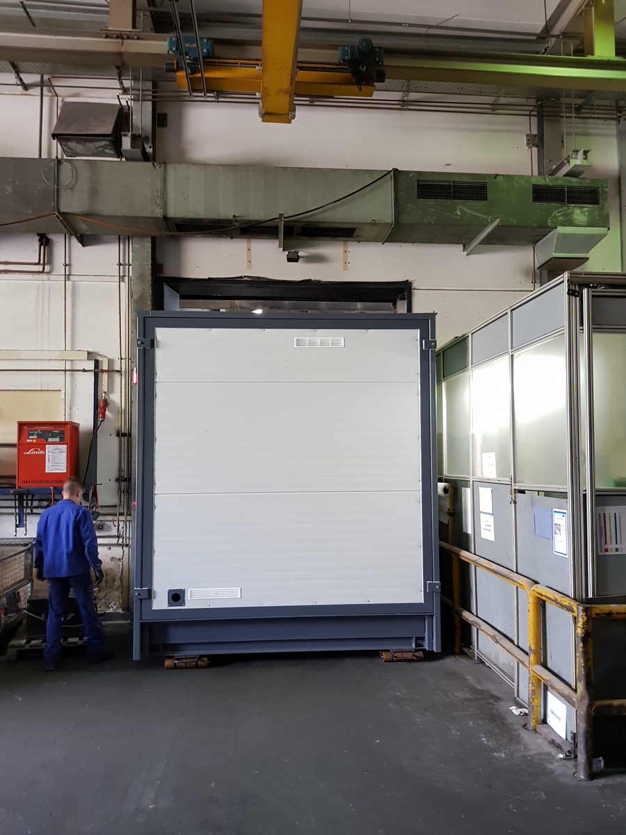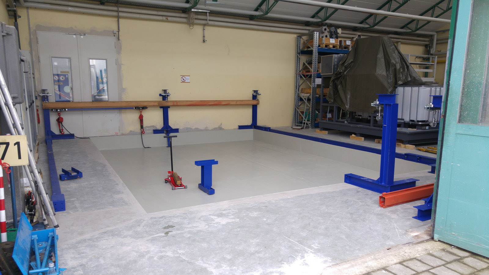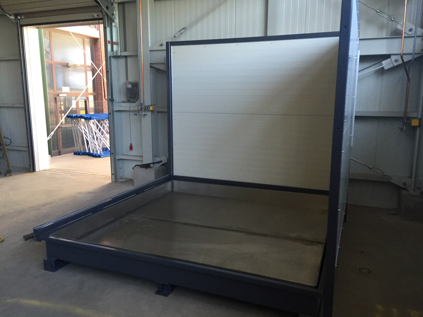 Dieser Kunde wollte gerne den Waschplatz möglichst nah an seiner Produktion haben. Einen Raum für den Waschplatz gab es auch bereits. Da der Kunde bereits wusste, dass ein Teil der Produktion innerhalb des nächsten Jahres umgestellt werden sollte, kam ein fester Waschplatz nicht in Frage. Ein fester Waschplatz hat neben einem umständlichen Genehmigungsverfahren einen weitaus größeren Nachteil: er ist nicht ortsveränderlich. Leider war der Zugang zu dem Raum recht niedrig, so dass wir die Höhe der Anlage an die Gegebenheiten vor Ort angepasst haben. Den großen Gabelstapler des Kunden konnten wir zum Abladen vom LKW benutzen, doch in der Halle haben wir die Anlage mit Gabelhubwagen transportiert.