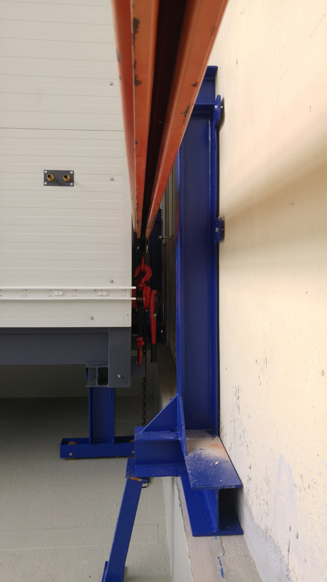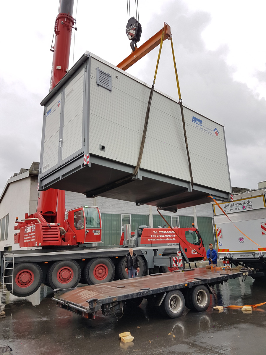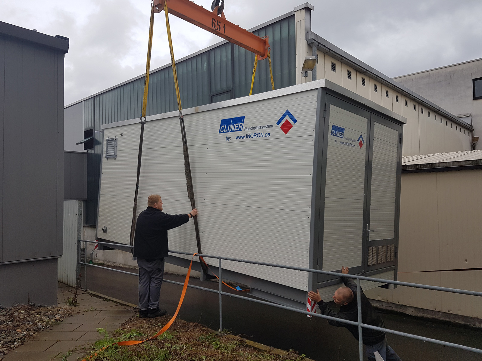 Nach einem Neubau ist bei diesem Kunden ein Innenhof zwischen zwei Hallen entstanden, welcher über lange Zeit ungenutzt war. Dieser Platz sollte für die Aufstellung des mobilen Waschplatzes genutzt werden. Einziges Problem dabei war, dass die Zufahrt zu dem Innenhof durch die Halle aufgrund eines Hochregallagers zu klein für unsere Anlage war. Daher war es deutlich einfacher, einen Kran zu bestellen und die Anlage in den Innenhof einzukranen, als das Hochregal zu demontieren.