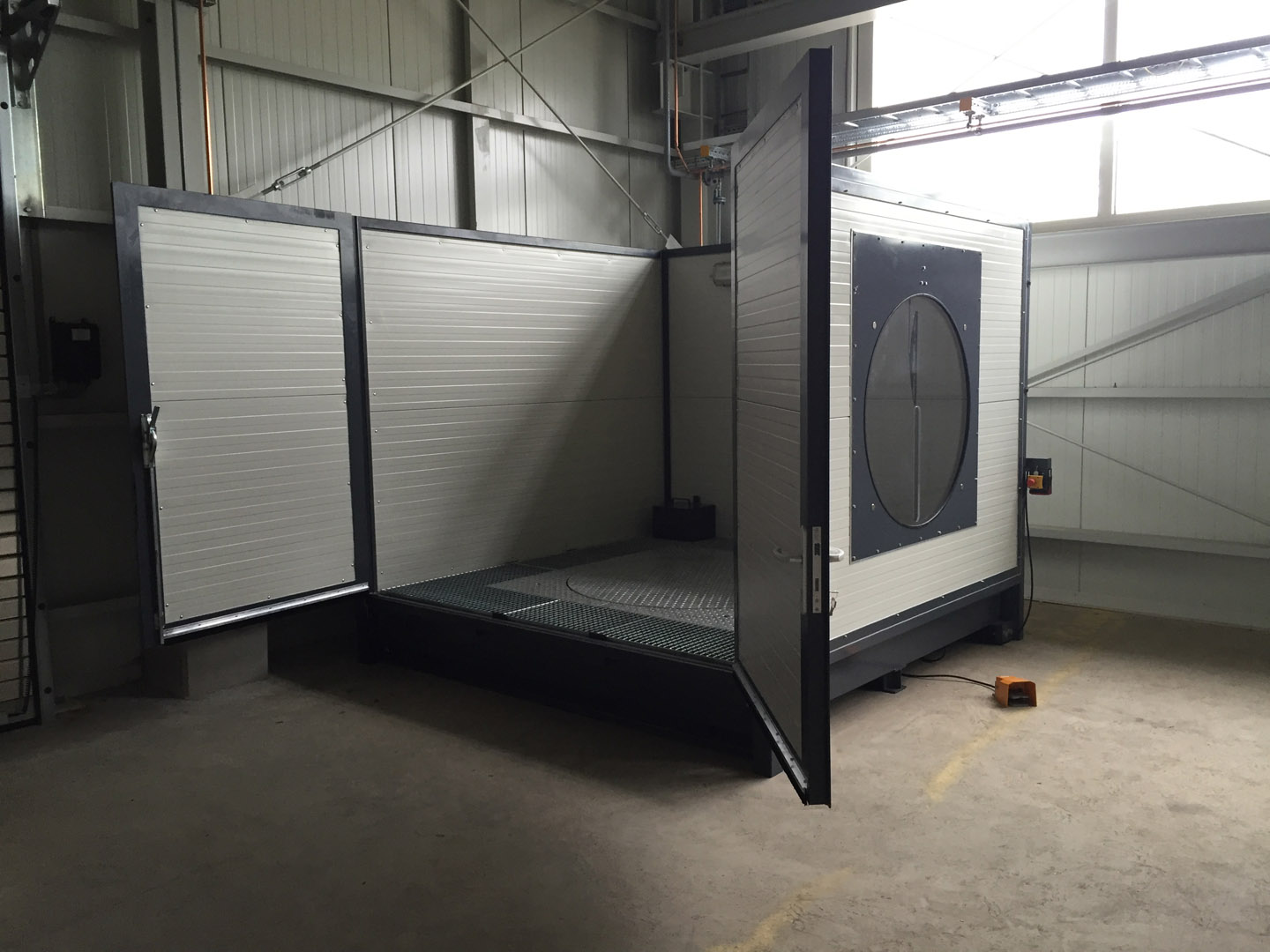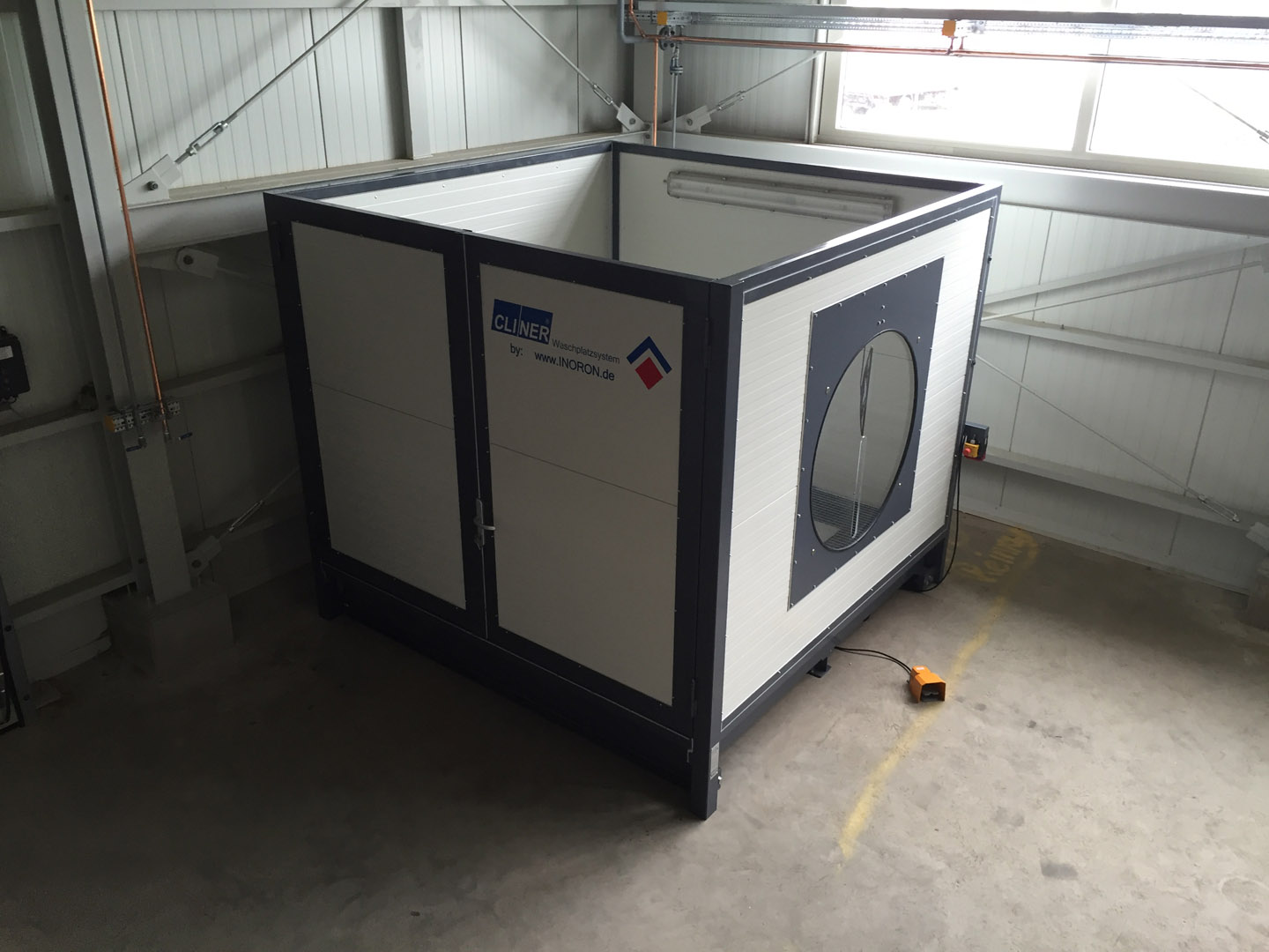 Selbst wenn der Zugang zu dem gewünschten Aufstellort deutlich schmaler als der gewünschte Waschplatz ist, gibt es die Möglichkeit, die Anlage aufzustellen. In diesem Fall haben wir die Anlage in Einzelteilen in die Halle mit einem speziell für diesen Zweck konstruierten Fahrgestell eingefahren und vor Ort montiert. So konnte der Kunde direkt in der Halle waschen und hat dank Drehteller und Rotationsfenster auch etwas für den Arbeitsschutz seiner Mitarbeiter getan.