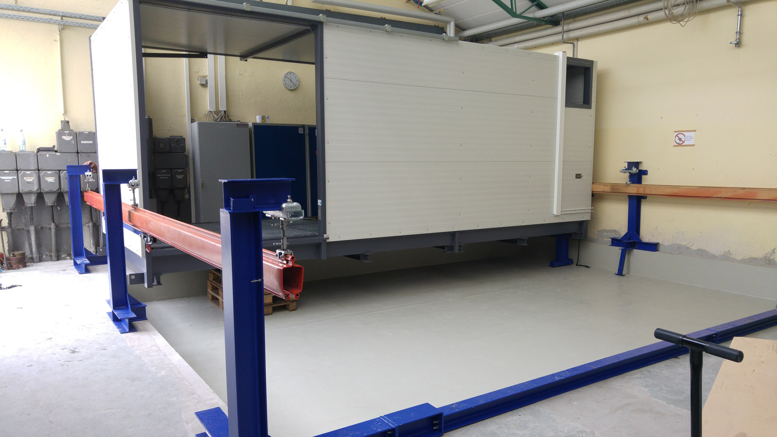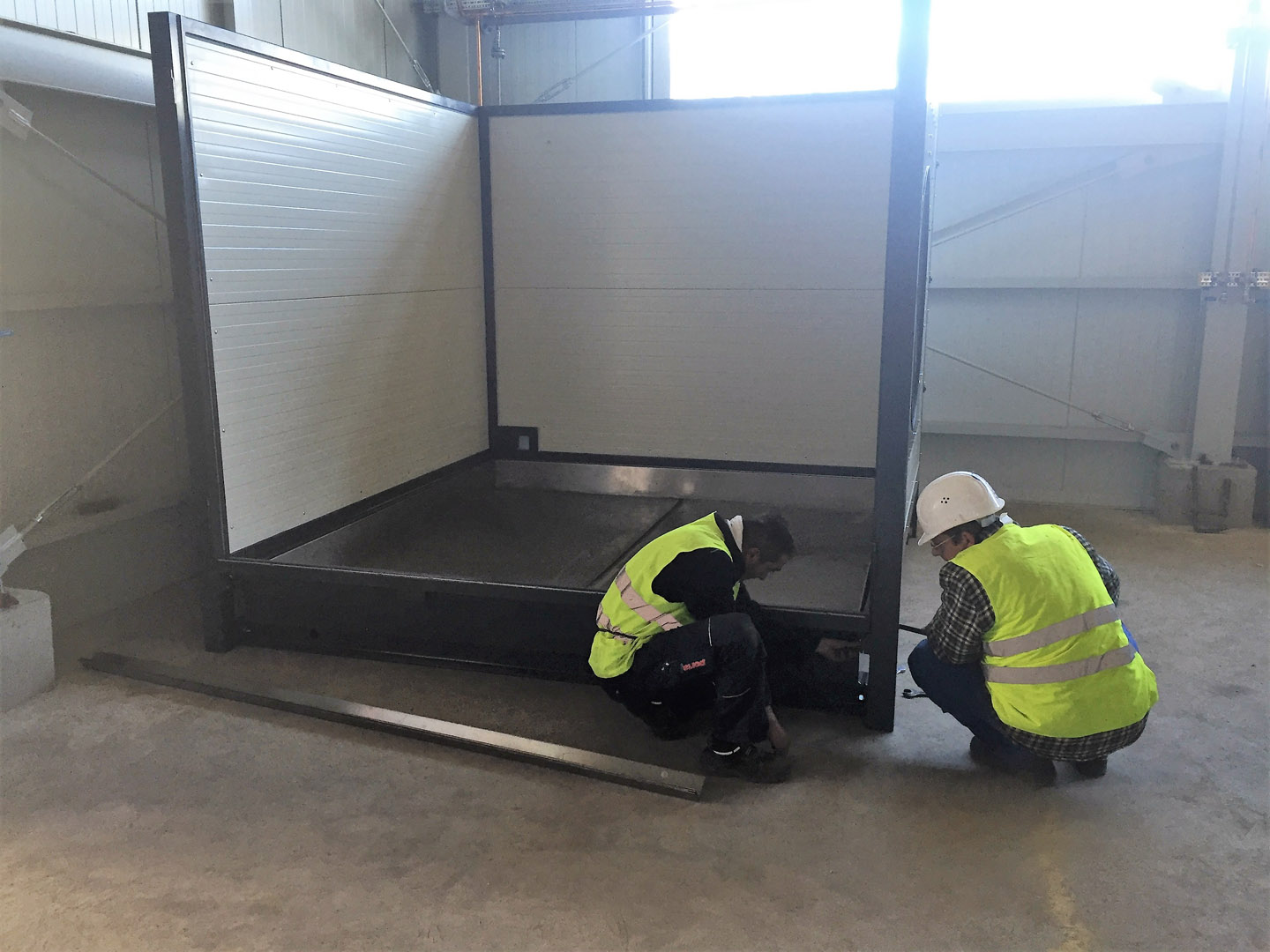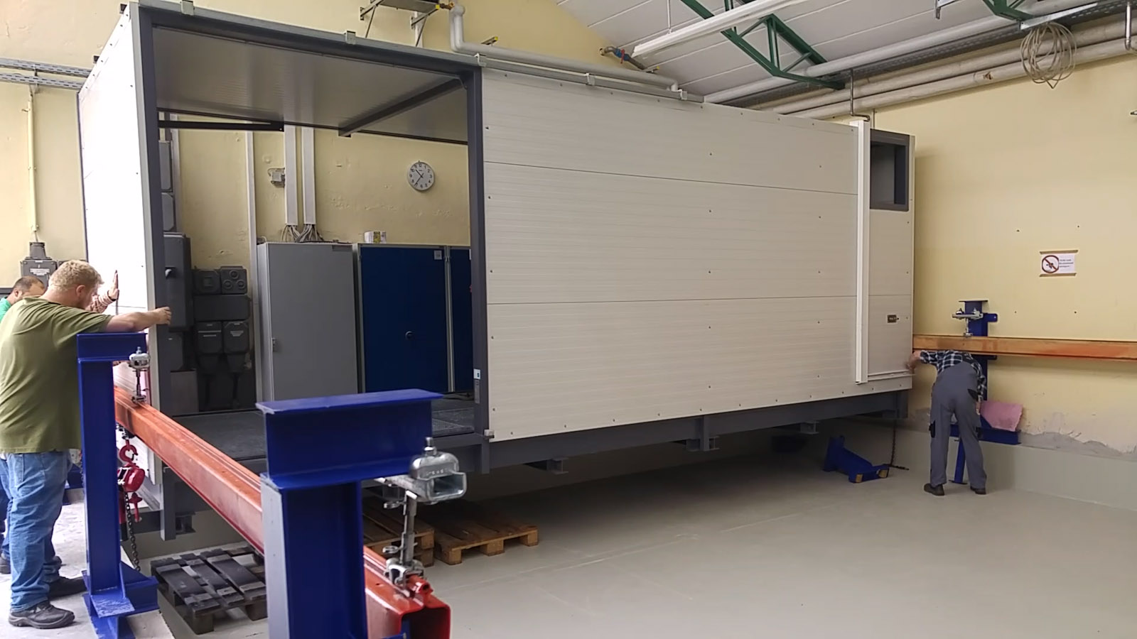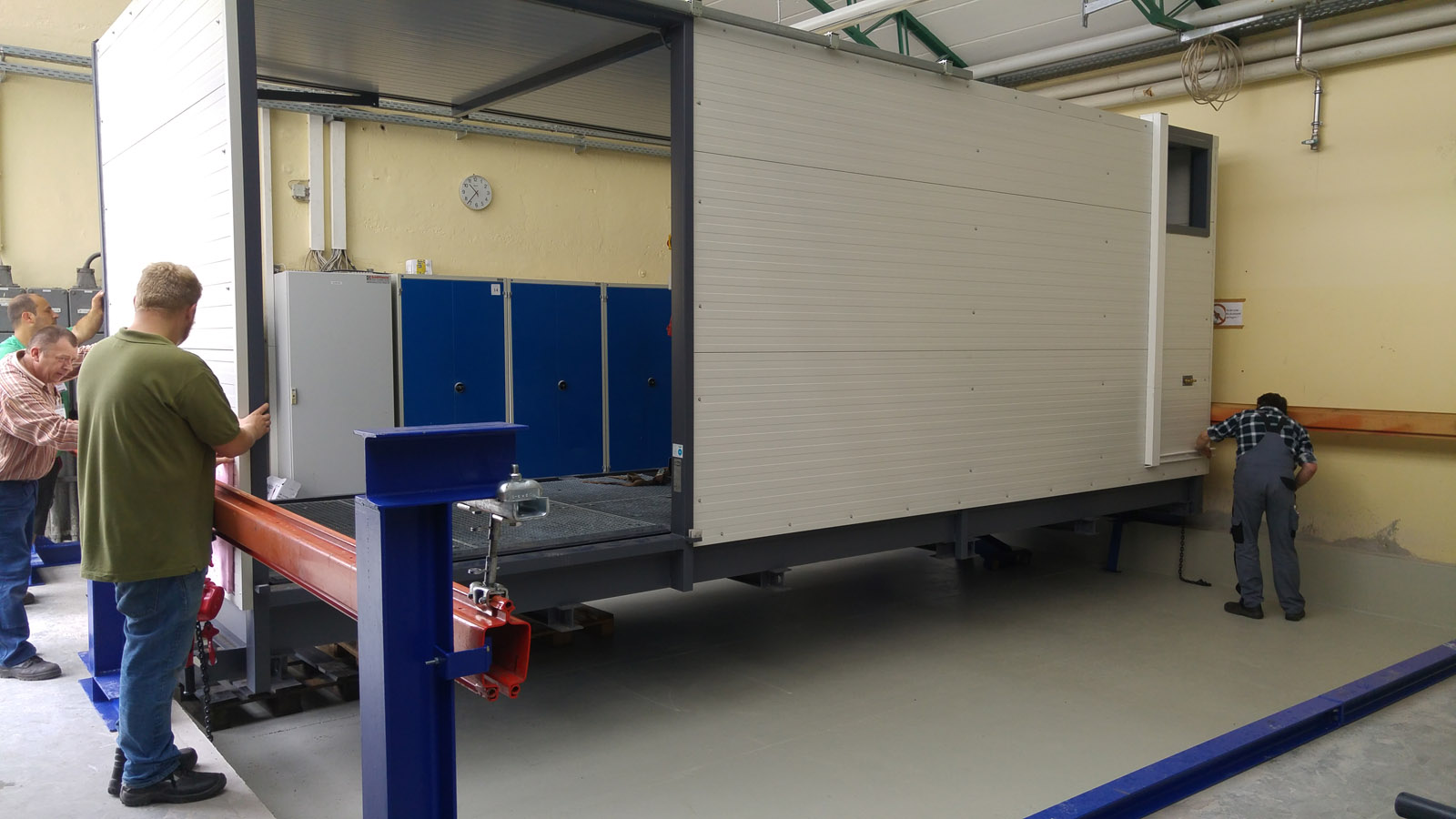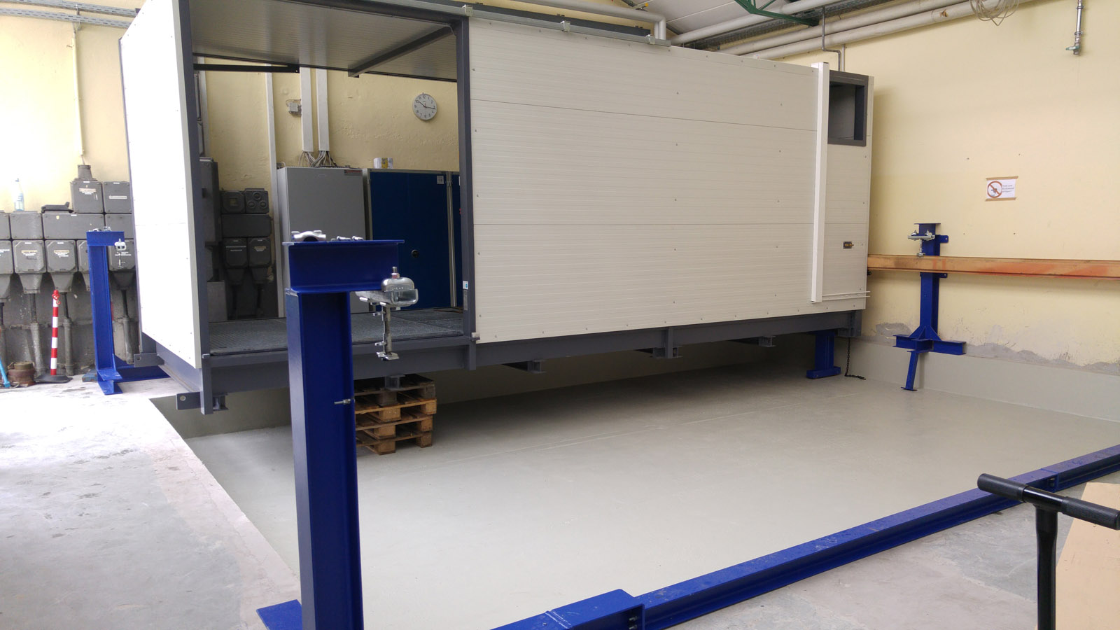 Wie kann man eine Anlage im Boden versenken, wenn sich kein Kran in der Halle befindet? Etwa, indem man einen mobilen Kran konstruiert und diesen mit zum Kunden bringt. Eine weitere Herausforderung war in diesem Fall, dass das Bodenfundament bereits im Fahrbereich lag. Aus diesem Grund haben wir noch mal ein erhöhtes Fahrgestell für die Anlage gebaut. Der Ablauf der Montage war recht einfach: