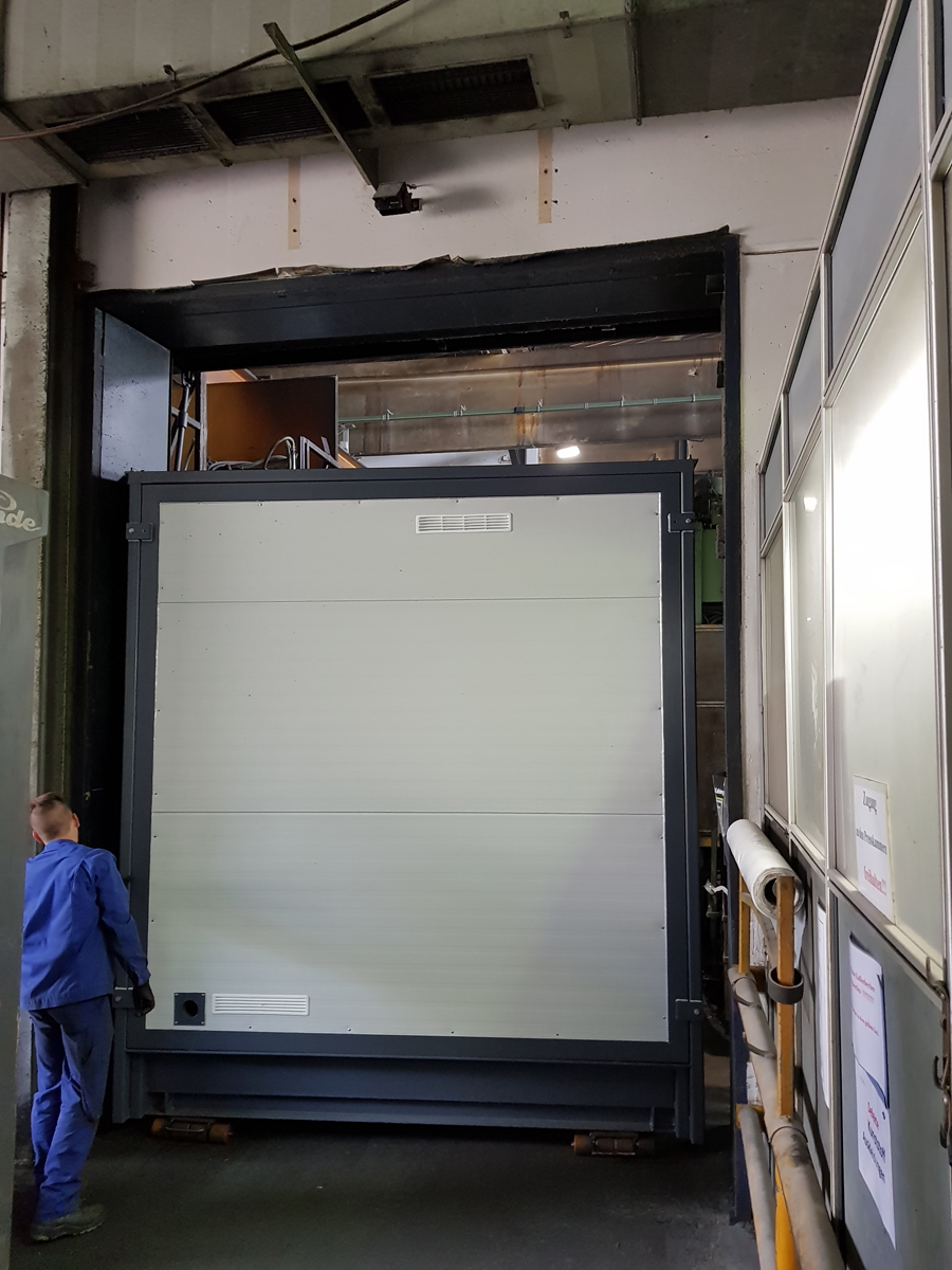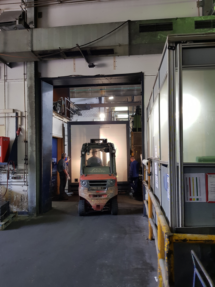 Natürlich messen wir vor der Lieferung genau die Maße möglicher Engstellen aus. Bei diesem Kunden war klar, dass unsere Anlage genau durch das Tor passt. Leider ist nicht aufgefallen, dass die Maschine direkt hinter dem Tor ein wenig in den Fahrbereich hineinragte. So passte zwar unsere Anlage durch das Tor aber nicht mehr ohne weiteres an der Maschine vorbei. Nachdem wir den seitlich montierten Notaus-Schalter sowie den Signalgeber demontiert hatten, blieben auf jeder Seite noch ungefähr 5cm Platz und wir konnten die Anlage an den gewünschten Standort setzen. Wenn Sie bei den Fotos in der Galerie genau hinschauen, sehen Sie auf dem letzten Foto die Kabel der demontierten Geräte.