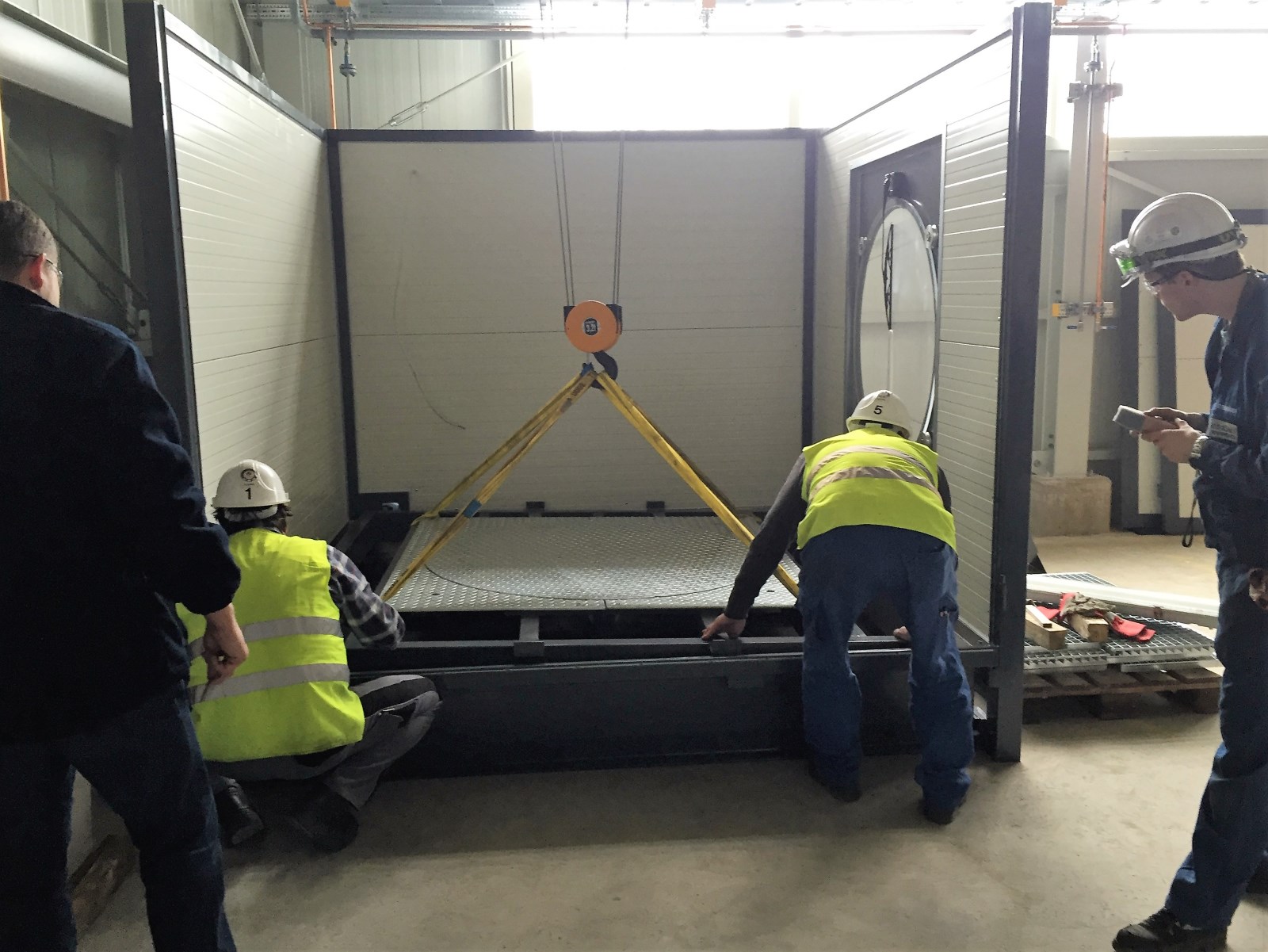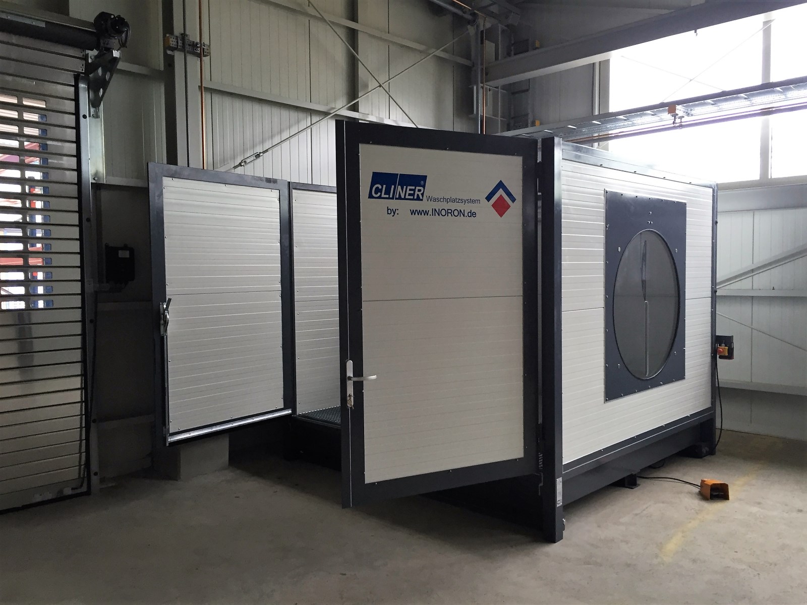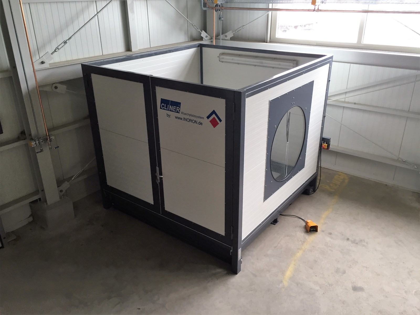 In diesem Fall haben wir unserem Kunden einen Waschplatz mit den Maßen 2,50m x 2,50m für seine Werkstatt geliefert. Da die bestehenden Hallentore zu klein waren, mussten wir den CLINER Waschplatz demontierbar auslegen. Die verschiedenen Bestandteile der Anlage wurden einzeln in die Halle mit einem Spezialgestell transportiert und vor Ort an dem Aufstellort montiert.