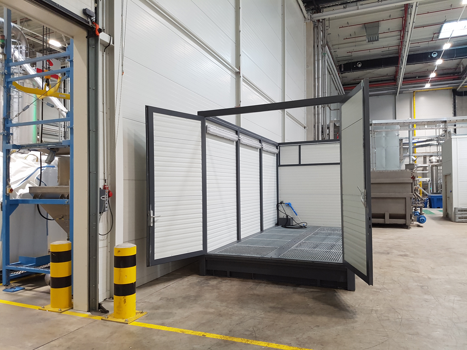 So können die zu waschenden Teile direkt vom Gabelstapler auf dem Waschplatz abgesetzt und dort mit dem Hochdruckreiniger gereinigt werden. Im hinteren, geschlossenen Bereich der Anlage befindet sich der Technikraum, in dessen Inneren die Wasseraufbereitung untergebracht ist. Anders als bei einem Ölabscheider, läuft bei dem CLINER Waschplatz ein geschlossenes System im Kreislauf.