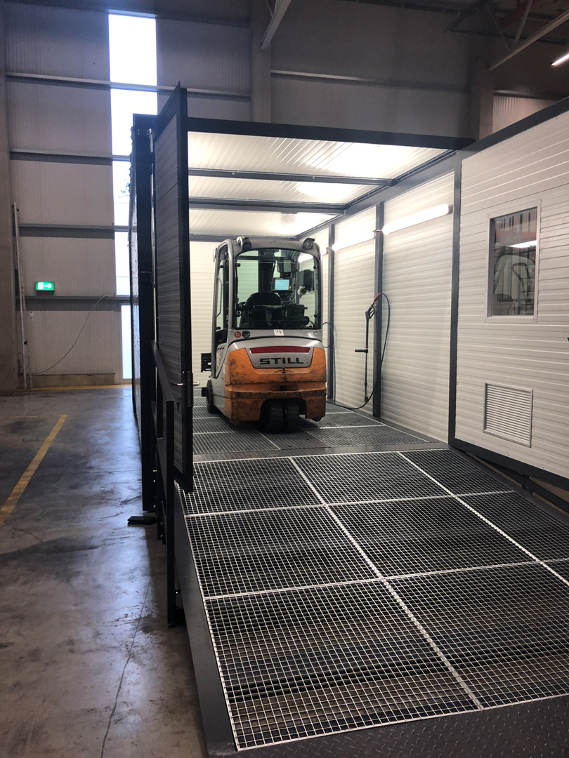 Elektro Gabelstapler haben aufgrund der Batterie oft ein sehr hohes Gewicht. Kombiniert mit den kleinen Reifen, haben die Geräte so eine hohe Punktbelastung. Mit dem Rahmensystem des CLINER Waschplatzes ist es kein Problem solche und auch höhere Belastungen aufzunehmen. Der Rahmen wurde bei der Planung entsprechend angepasst und es wurden Schwerlastgitterroste benutzt.