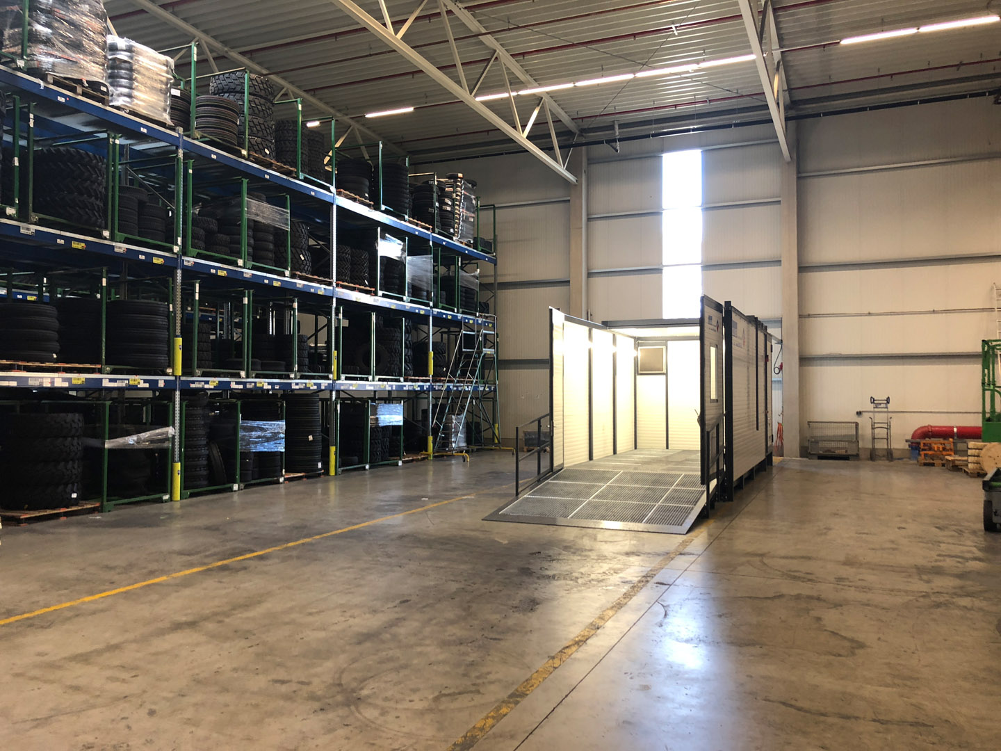 Neben der Auffahrrampe für die Gabelstapler wurde in die Anlage auch eine Schiebedach mit integriert. So lassen sich auch Hochregalgabelstapler mit einem hohen Mast bei geöffnetem Dach einfach und schnell reinigen.