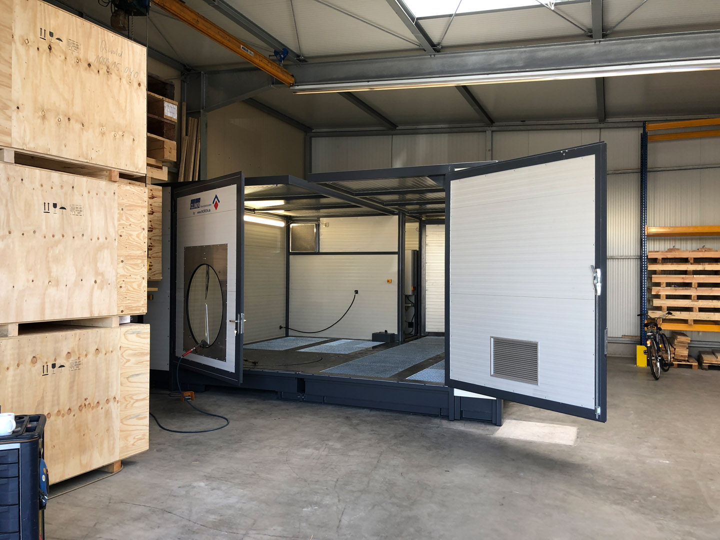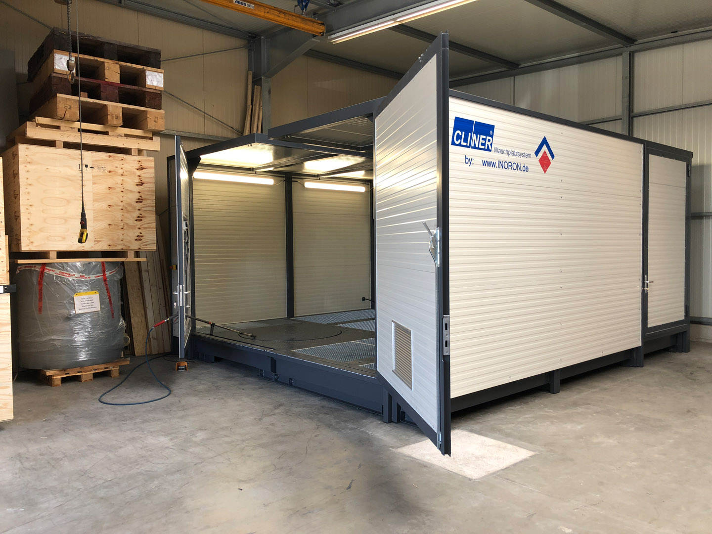 Aufgrund der Abmessungen der Bauteile hat sich der Kunde für einen CLINER C552 entschieden. Bei diesem Modell werden zwei CLINER C550 Basismodule miteinander verbunden. So ist ein Waschraum mit einer Fläche von ~ 5,5 x 5m entstanden.