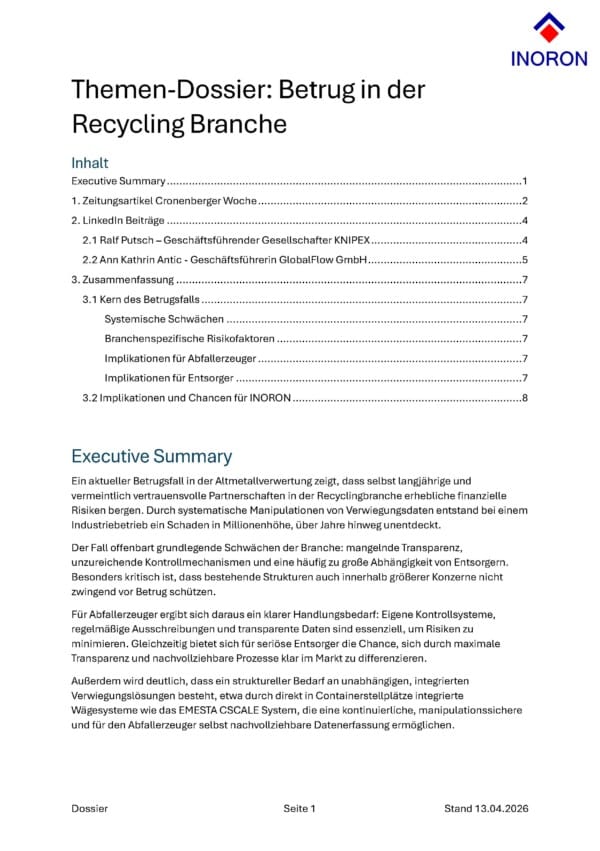 Laden Sie sich jetzt unser kostenloses Themen-Dossier „Betrug in der Recycling-Branche“ herunter (inkl. Zeitungsartikel und LinkedIn-Analyse). Link: Themen-Dossier Betrug in der Recycling Branche